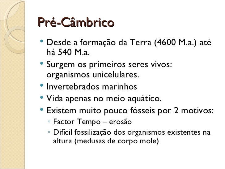 Pré-Câmbrico <ul><li>Desde a formação da Terra (4600 M.a.) até há 540 M.a. </li></ul><ul><li>Surgem os primeiros seres viv...