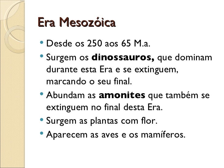 15. 17. Era Mesozóica <ul><li>Desde os 250 aos 65 M.a. </li></ul><ul><li>Surgem os dinossauros, que dominam durante esta Era e se extinguem, marcando o seu final. </li></ul><ul><li>Abundam as amonites que também se extinguem no final desta Era. </li></ul><ul><li>Surgem as plantas com flor. </li></ul><ul><li>Aparecem as aves e os mamíferos. </li></ul>