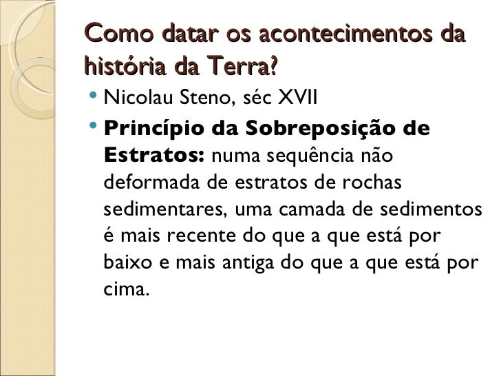 Como datar os acontecimentos da história da Terra? <ul><li>Nicolau Steno, séc XVII </li></ul><ul><li>Princípio da Sobrepos...