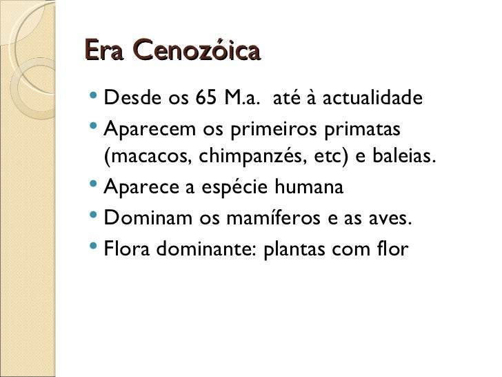 Era Cenozóica <ul><li>Desde os 65 M.a.  até à actualidade </li></ul><ul><li>Aparecem os primeiros primatas (macacos, chimp...