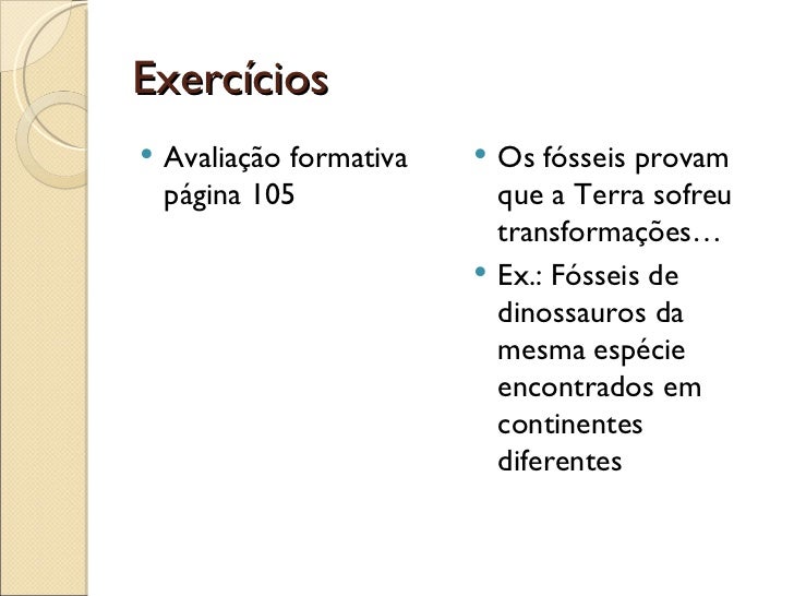 Exercícios <ul><li>Avaliação formativa página 105 </li></ul><ul><li>Os fósseis provam que a Terra sofreu transformações… <...