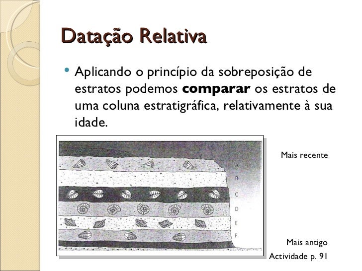 3. 3. Datação Relativa <ul><li>Aplicando o princípio da sobreposição de estratos podemos comparar os estratos de uma coluna estratigráfica, relativamente à sua idade. </li></ul>Mais recente Mais antigo Actividade p. 91
