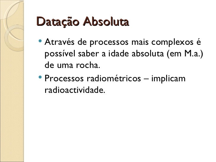Datação Absoluta <ul><li>Através de processos mais complexos é possível saber a idade absoluta (em M.a.) de uma rocha.  </...