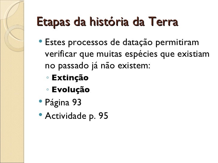 5. 6. Etapas da história da Terra <ul><li>Estes processos de datação permitiram verificar que muitas espécies que existiam no passado já não existem: </li></ul><ul><ul><li>Extinção </li></ul></ul><ul><ul><li>Evolução </li></ul></ul><ul><li>Página 93 </li></ul><ul><li>Actividade p. 95 </li></ul>