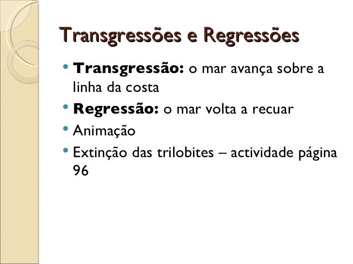 Transgressões e Regressões <ul><li>Transgressão:  o mar avança sobre a linha da costa </li></ul><ul><li>Regressão:  o mar ...