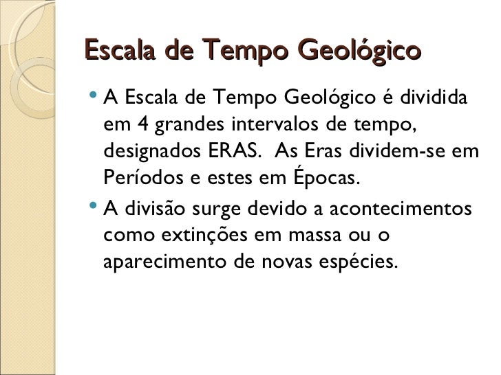 8. 9. Escala de Tempo Geológico <ul><li>A Escala de Tempo Geológico é dividida em 4 grandes intervalos de tempo, designados ERAS. As Eras dividem-se em Períodos e estes em Épocas. </li></ul><ul><li>A divisão surge devido a acontecimentos como extinções em massa ou o aparecimento de novas espécies. </li></ul>