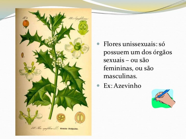 11. 11. Flores unissexuais: só possuem um dos órgãos sexuais – ou são femininas, ou são masculinas.<br />Ex: Azevinho<br />