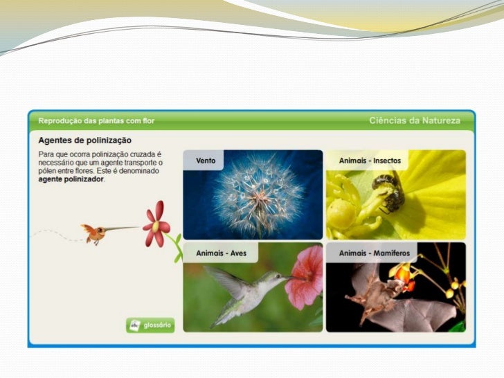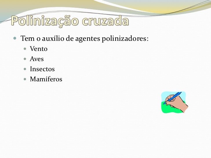 20. 20. Polinização cruzada<br />Tem o auxílio de agentes polinizadores:<br />Vento<br />Aves<br />Insectos<br />Mamíferos<br />