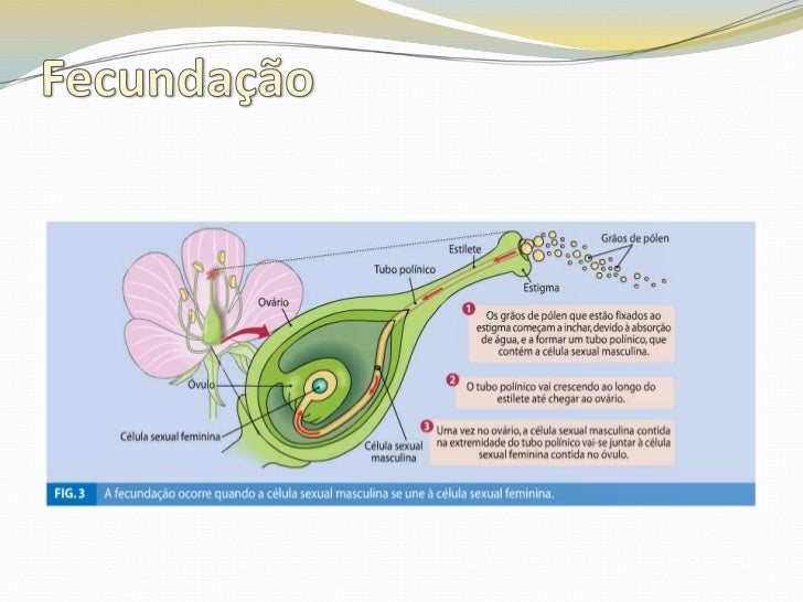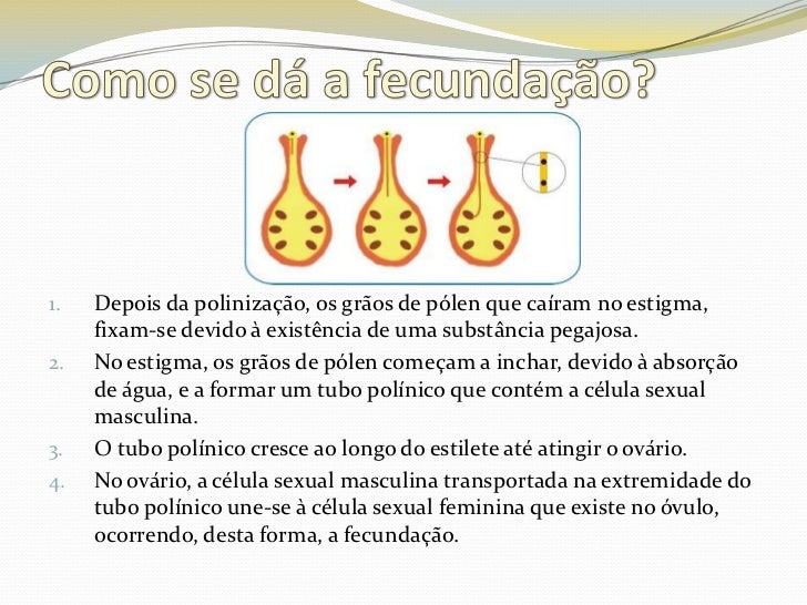22. 22. Como se dá a fecundação?<br />Depois da polinização, os grãos de pólen que caíram no estigma, fixam-se devido à existência de uma substância pegajosa.<br />No estigma, os grãos de pólen começam a inchar, devido à absorção de água, e a formar um tubo polínico que contém a célula sexual masculina.<br />O tubo polínico cresce ao longo do estilete até atingir o ovário.<br />No ovário, a célula sexual masculina transportada na extremidade do tubo polínico une-se à célula sexual feminina que existe no óvulo, ocorrendo, desta forma, a fecundação.<br />