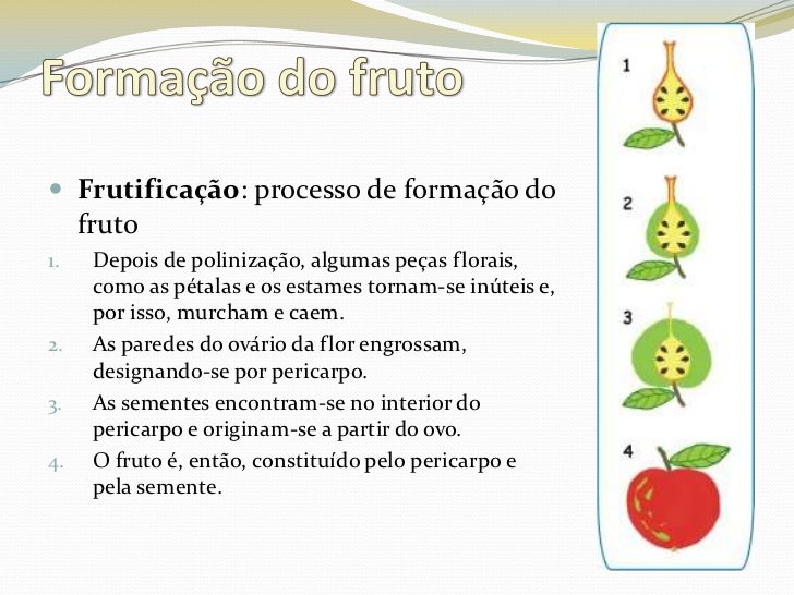 24. 24. Formação do fruto<br />Frutificação: processo de formação do fruto<br />Depois de polinização, algumas peças florais, como as pétalas e os estames tornam-se inúteis e, por isso, murcham e caem. <br />As paredes do ovário da flor engrossam, designando-se por pericarpo. <br />As sementes encontram-se no interior do pericarpo e originam-se a partir do ovo. <br />O fruto é, então, constituído pelo pericarpo e pela semente. <br />