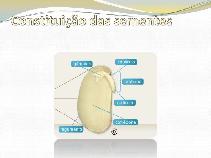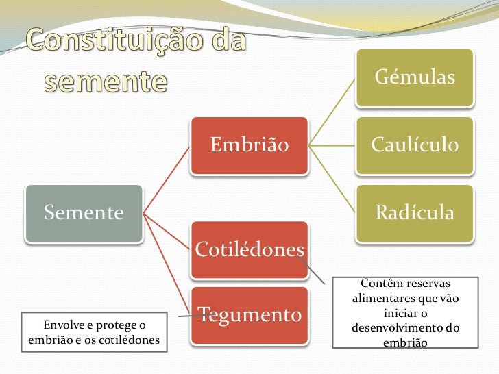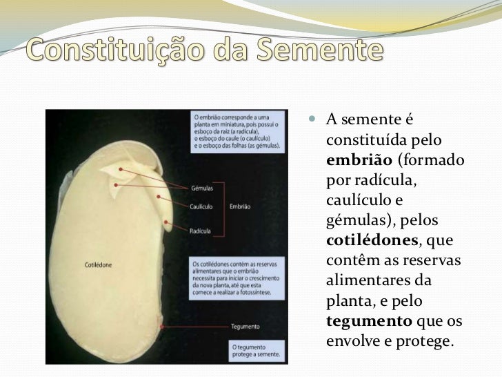 33. 33. Constituição da Semente<br />A semente é constituída pelo embrião (formado por radícula, caulículo e gémulas), pelos cotilédones, que contêm as reservas alimentares da planta, e pelo tegumento que os envolve e protege.<br />