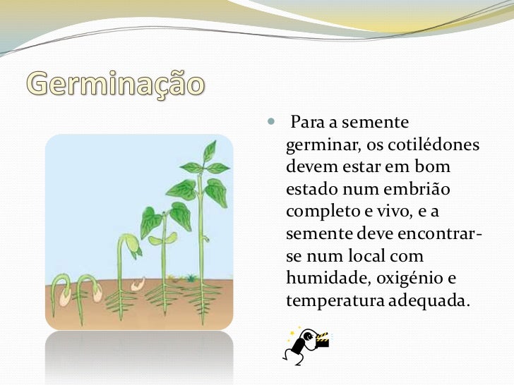 35. 35. Germinação<br />Para a semente germinar, os cotilédones devem estar em bom estado num embrião completo e vivo, e a semente deve encontrar-se num local com humidade, oxigénio e temperatura adequada. <br />
