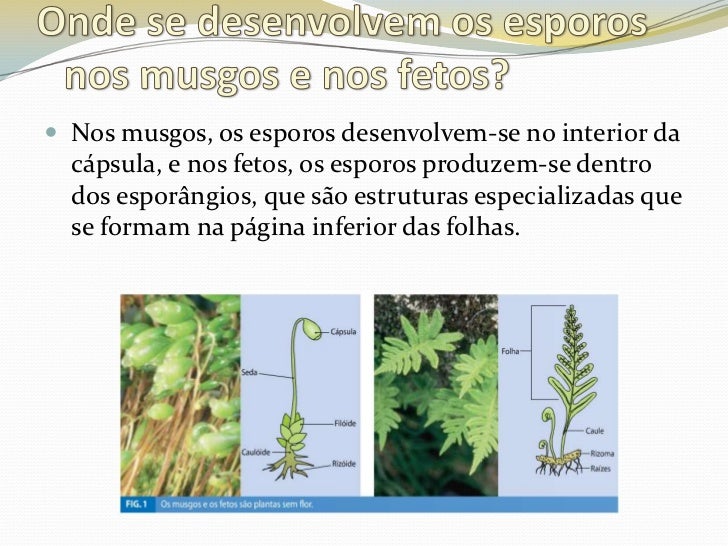 38. 38. Onde se desenvolvem os esporos nos musgos e nos fetos?<br />Nos musgos, os esporos desenvolvem-se no interior da cápsula, e nos fetos, os esporos produzem-se dentro dos esporângios, que são estruturas especializadas que se formam na página inferior das folhas.<br />