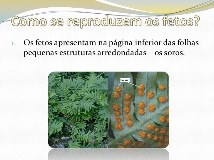 39. 39. Como se reproduzem os fetos?<br />Os fetos apresentam na página inferior das folhas pequenas estruturas arredondadas – os soros.<br />