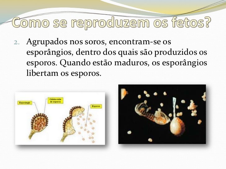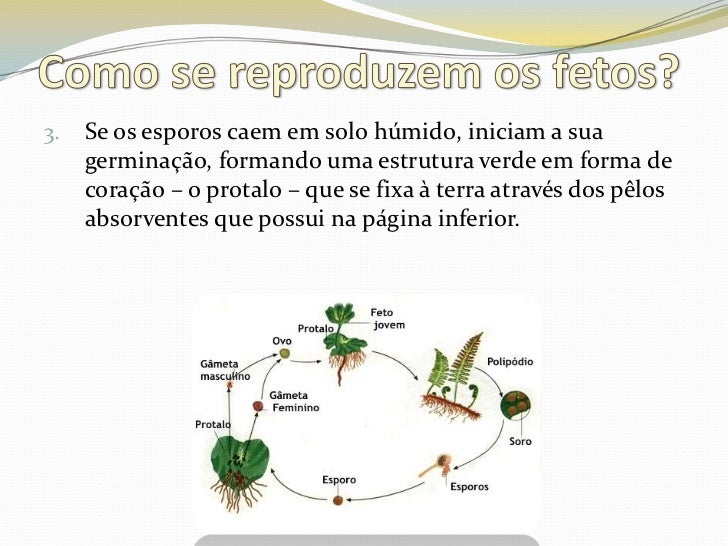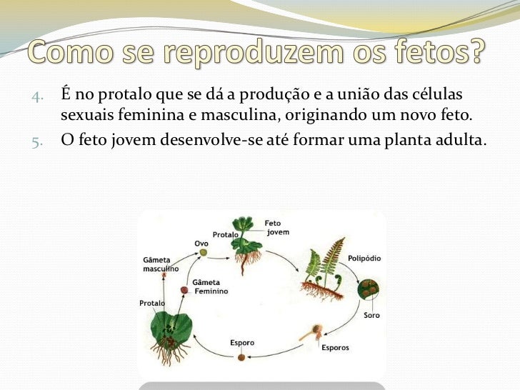 42. 42. É no protalo que se dá a produção e a união das células sexuais feminina e masculina, originando um novo feto.<br />O feto jovem desenvolve-se até formar uma planta adulta.<br />Como se reproduzem os fetos?<br />