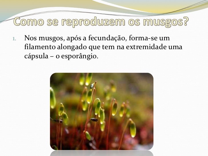 43. 43. Como se reproduzem os musgos?<br />Nos musgos, após a fecundação, forma-se um filamento alongado que tem na extremidade uma cápsula – o esporângio. <br />