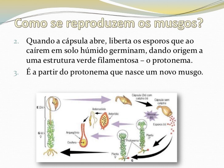 44. 44. Como se reproduzem os musgos?<br />Quando a cápsula abre, liberta os esporos que ao caírem em solo húmido germinam, dando origem a uma estrutura verde filamentosa – o protonema. <br />É a partir do protonema que nasce um novo musgo. <br />
