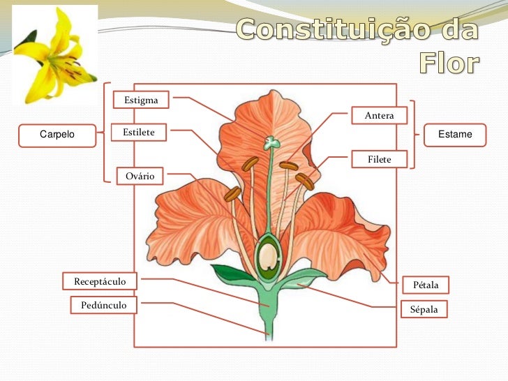 5. 5. Constituição da Flor<br />Estigma<br />Antera<br />Estilete<br />Estame<br />Carpelo<br />Filete<br />Ovário<br />Receptáculo<br />Pétala<br />Pedúnculo<br />Sépala<br />