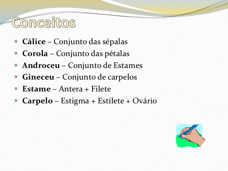 6. 6. Conceitos<br />Cálice – Conjunto das sépalas<br />Corola – Conjunto das pétalas<br />Androceu – Conjunto de Estames<br />Gineceu – Conjunto de carpelos<br />Estame – Antera + Filete<br />Carpelo – Estigma + Estilete + Ovário<br />