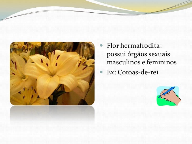 9. 9. Flor hermafrodita: possui órgãos sexuais masculinos e femininos<br />Ex: Coroas-de-rei<br />