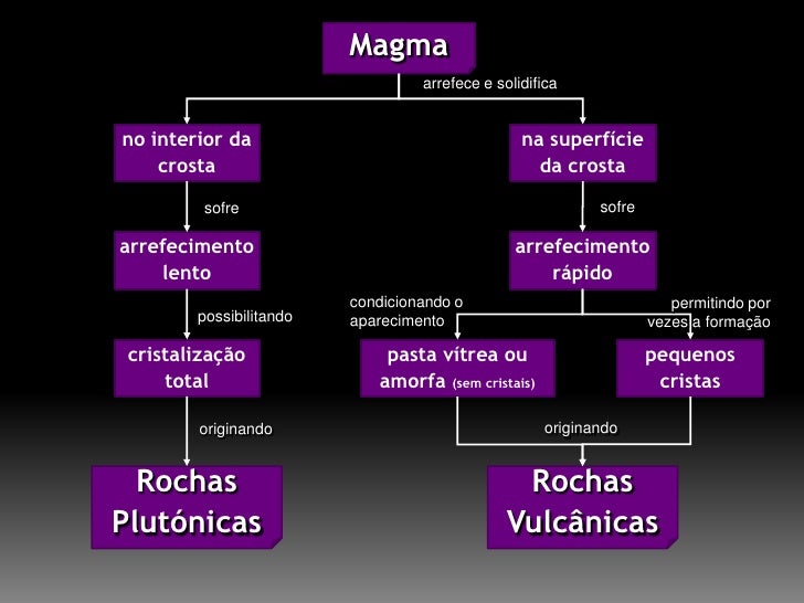 13. 13. Magma<br />arrefece e solidifica<br />no interior da crosta<br />na superfície da crosta<br />sofre<br />sofre<br />arrefecimento lento<br />arrefecimento rápido<br />condicionando o aparecimento<br />permitindo por vezes a formação <br />possibilitando <br />cristalização total<br />pasta vítrea ou amorfa (sem cristais)<br />pequenos cristas<br />originando<br />originando<br />Rochas Plutónicas<br />Rochas Vulcânicas<br />