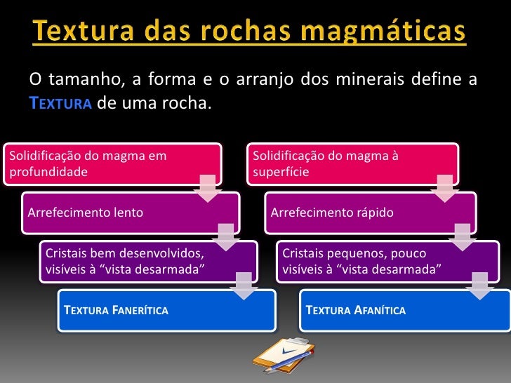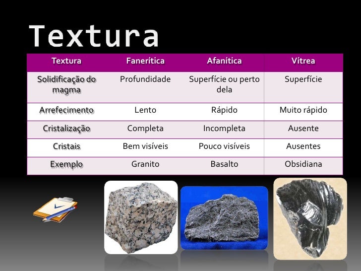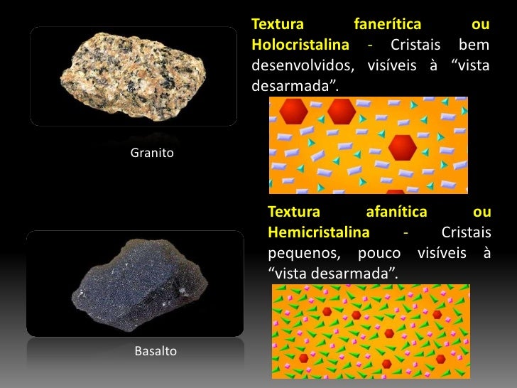 8. 8. Textura fanerítica ou Holocristalina- Cristais bem desenvolvidos, visíveis à “vista desarmada”.<br />Granito<br />Textura afanítica ou Hemicristalina- Cristais pequenos, pouco visíveis à “vista desarmada”.<br />Basalto<br />
