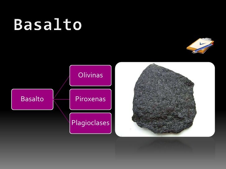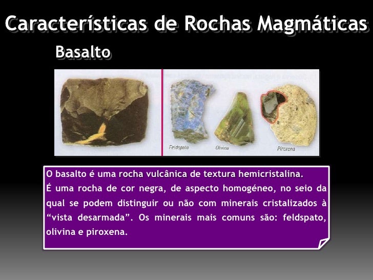 20. 20. Características de Rochas Magmáticas<br />Basalto<br />O basalto é uma rocha vulcânica de textura hemicristalina.<br />É uma rocha de cor negra, de aspecto homogéneo, no seio da qual se podem distinguir ou não com minerais cristalizados à “vista desarmada”. Os minerais mais comuns são: feldspato, olivina e piroxena.<br />