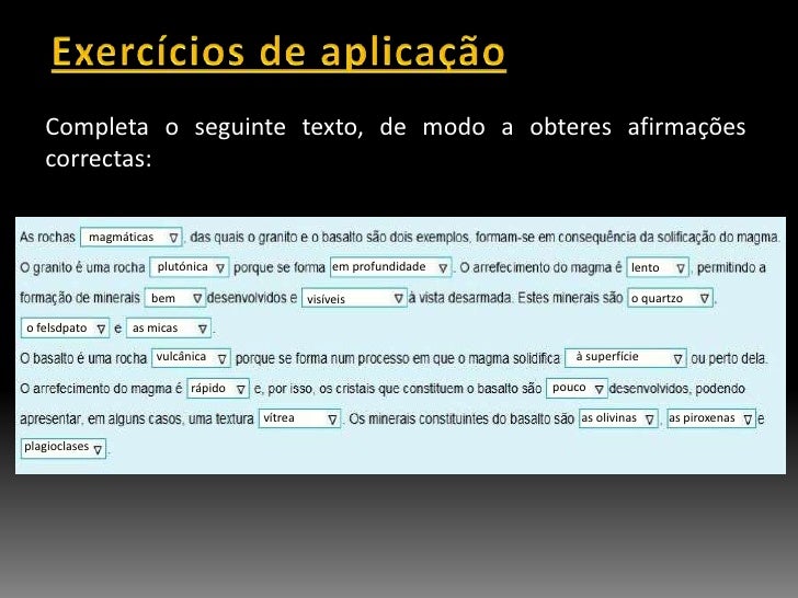 17. 17. Exercícios de aplicação<br />Completa o seguinte texto, de modo a obteres afirmações correctas:<br />magmáticas<br />plutónica<br />em profundidade<br />lento<br />o quartzo<br />bem<br />visíveis<br />as micas<br />o felsdpato<br />à superfície<br />vulcânica<br />pouco<br />rápido<br />as piroxenas<br />as olivinas<br />vítrea<br />plagioclases<br />