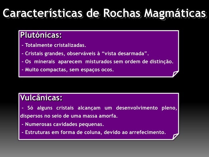 18. 18. Características de Rochas Magmáticas<br />Plutónicas:<br /> - Totalmente cristalizadas.<br /> - Cristais grandes, observáveis à “vista desarmada”.<br /> - Os minerais aparecem misturados sem ordem de distinção.<br /> - Muito compactas, sem espaços ocos.<br />Vulcânicas:<br /> - Só alguns cristais alcançam um desenvolvimento pleno, dispersos no seio de uma massa amorfa.<br /> - Numerosas cavidades pequenas.<br /> - Estruturas em forma de coluna, devido ao arrefecimento.<br />