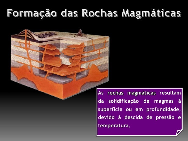2. 2. Formação das Rochas Magmáticas<br />As rochas magmáticas resultam da solidificação de magmas à superfície ou em profundidade, devido à descida de pressão e temperatura.<br />