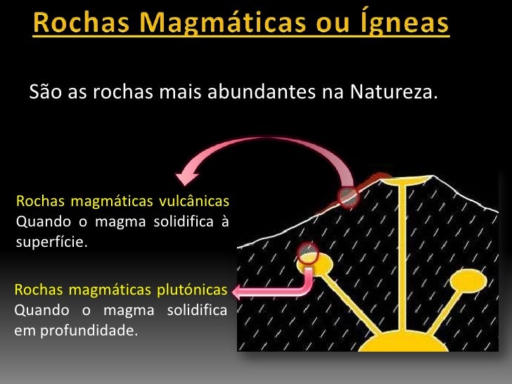 3. 3. Rochas Magmáticas ou Ígneas<br />São as rochas mais abundantes na Natureza.<br />Rochas magmáticas vulcânicas Quando o magma solidifica à superfície.<br />Rochas magmáticas plutónicas Quando o magma solidifica em profundidade.<br />