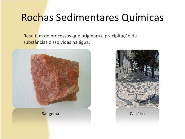 22. 22. Rochas Sedimentares Químicas<br />Resultam de processos que originam a precipitação de substâncias dissolvidas na água.<br />Sal-gema<br />Calcário<br />