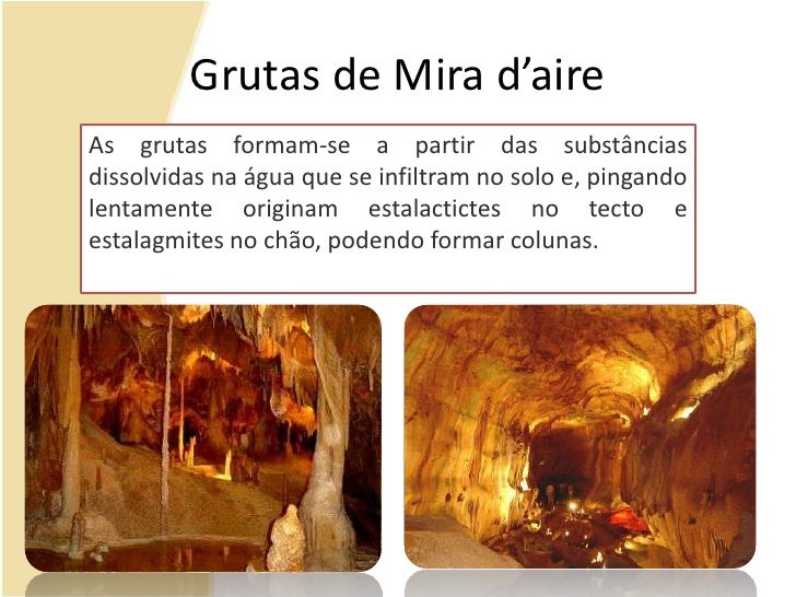 23. 23. Grutas de Mira d’aire<br />As grutas formam-se a partir das substâncias dissolvidas na água que se infiltram no solo e, pingando lentamente originam estalactictes no tecto e estalagmites no chão, podendo formar colunas.<br />