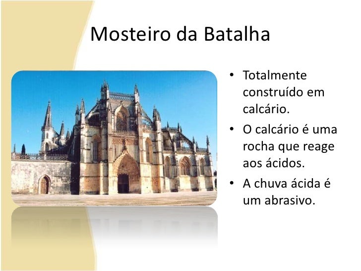25. 25. Mosteiro da Batalha<br />Totalmente construído em calcário. <br />O calcário é uma rocha que reage aos ácidos.<br />A chuva ácida é um abrasivo.<br />