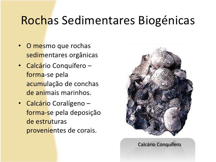 26. 26. Rochas Sedimentares Biogénicas<br />O mesmo que rochas sedimentares orgânicas<br />Calcário Conquífero – forma-se pela acumulação de conchas de animais marinhos.<br />Calcário Coralígeno – forma-se pela deposição de estruturas provenientes de corais.<br />Calcário Conquífero<br />