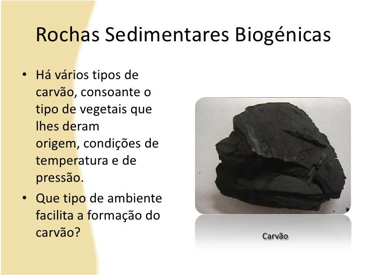 27. 27. Rochas Sedimentares Biogénicas<br />Há vários tipos de carvão, consoante o tipo de vegetais que lhes deram origem, condições de temperatura e de pressão.<br />Que tipo de ambiente facilita a formação do carvão?<br />Carvão<br />