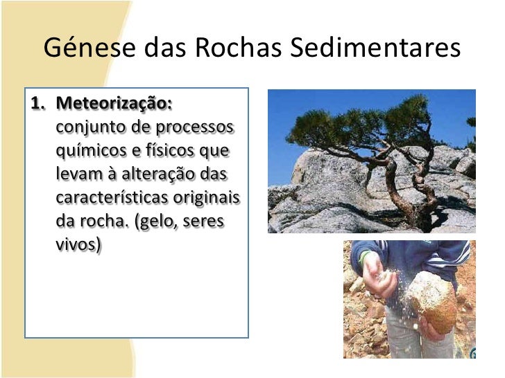 6. 6. Génese das Rochas Sedimentares<br />Meteorização: conjunto de processos químicos e físicos que levam à alteração das características originais da rocha. (gelo, seres vivos)<br />