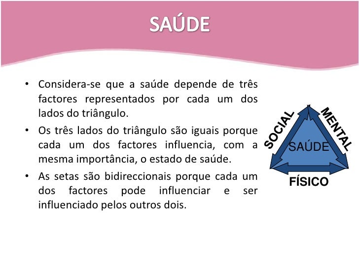 11. 11. SAÚDE<br />SOCIAL<br />MENTAL<br />SAÚDE<br />FÍSICO<br />Considera-se que a saúde depende de três factores representados por cada um dos lados do triângulo.<br />Os três lados do triângulo são iguais porque cada um dos factores influencia, com a mesma importância, o estado de saúde.<br />As setas são bidireccionais porque cada um dos factores pode influenciar e ser influenciado pelos outros dois.<br />