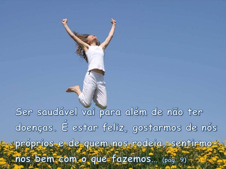 13. 13. Ser saudável vai para além de não ter doenças. É estar feliz, gostarmos de nós próprios e de quem nos rodeia, sentirmo-nos bem com o que fazemos… (pág. 9)<br />
