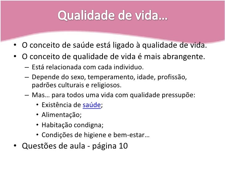 14. 14. Qualidade de vida…<br />O conceito de saúde está ligado à qualidade de vida.<br />O conceito de qualidade de vida é mais abrangente.<br />Está relacionada com cada individuo.<br />Depende do sexo, temperamento, idade, profissão, padrões culturais e religiosos.<br />Mas… para todos uma vida com qualidade pressupõe:<br />Existência de saúde;<br />Alimentação;<br />Habitação condigna;<br />Condições de higiene e bem-estar…<br />Questões de aula - página 10<br />