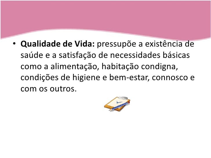 15. 15. Qualidade de Vida: pressupõe a existência de saúde e a satisfação de necessidades básicas como a alimentação, habitação condigna, condições de higiene e bem-estar, connosco e com os outros.<br />