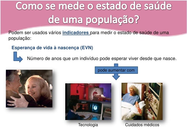 17. 17. pode aumentar com<br />Podem ser usados vários indicadorespara medir o estado de saúde de uma população:<br />Esperança de vida à nascença (EVN)<br />Número de anos que um indivíduo pode esperar viver desde que nasce.<br />Tecnologia<br />Cuidados médicos<br />Como se mede o estado de saúde de uma população?<br />