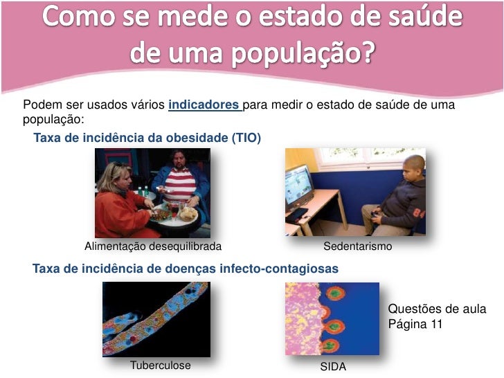 19. 19. Podem ser usados vários indicadorespara medir o estado de saúde de uma população:<br />Taxa de incidência da obesidade (TIO)<br />Sedentarismo<br />Alimentação desequilibrada<br />Taxa de incidência de doenças infecto-contagiosas<br />Questões de aula<br />Página 11<br />Tuberculose <br />SIDA<br />Como se mede o estado de saúde de uma população?<br />