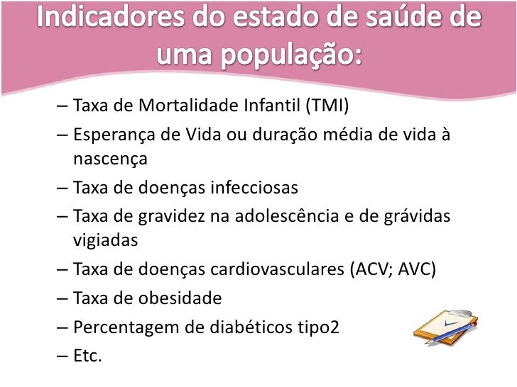 27. 27. Indicadores do estado de saúde de uma população:<br />Taxa de Mortalidade Infantil (TMI)<br />Esperança de Vida ou duração média de vida à nascença<br />Taxa de doenças infecciosas<br />Taxa de gravidez na adolescência e de grávidas vigiadas<br />Taxa de doenças cardiovasculares (ACV; AVC)<br />Taxa de obesidade<br />Percentagem de diabéticos tipo2<br />Etc.<br />