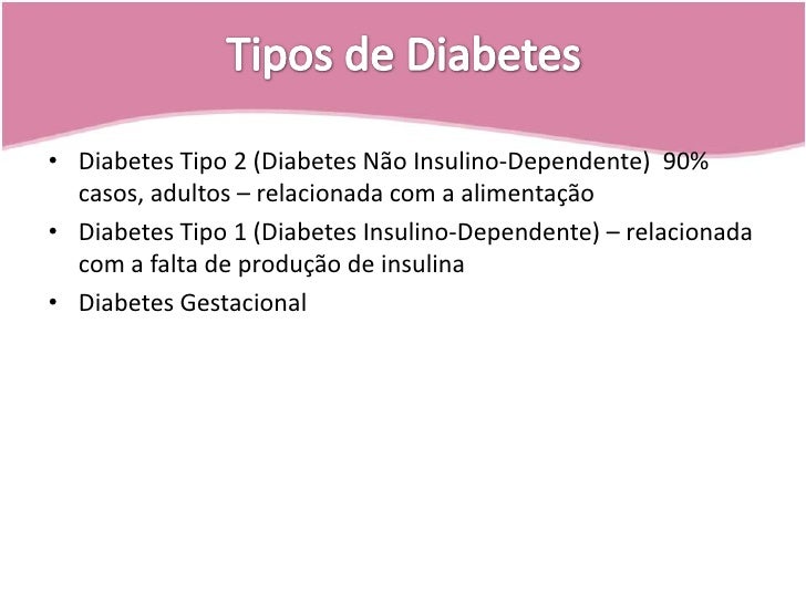 28. 28. Tipos de Diabetes<br />Diabetes Tipo 2 (Diabetes Não Insulino-Dependente) 90% casos, adultos – relacionada com a alimentação<br />Diabetes Tipo 1 (Diabetes Insulino-Dependente) – relacionada com a falta de produção de insulina<br />Diabetes Gestacional<br />