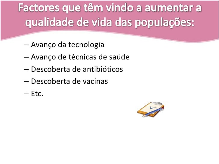 29. 29. Factores que têm vindo a aumentar a qualidade de vida das populações:<br />Avanço da tecnologia<br />Avanço de técnicas de saúde<br />Descoberta de antibióticos<br />Descoberta de vacinas<br />Etc.<br />