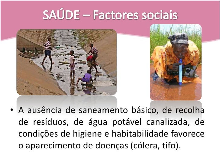 30. 30. SAÚDE – Factores sociais<br />A ausência de saneamento básico, de recolha de resíduos, de água potável canalizada, de condições de higiene e habitabilidade favorece o aparecimento de doenças (cólera, tifo).<br />