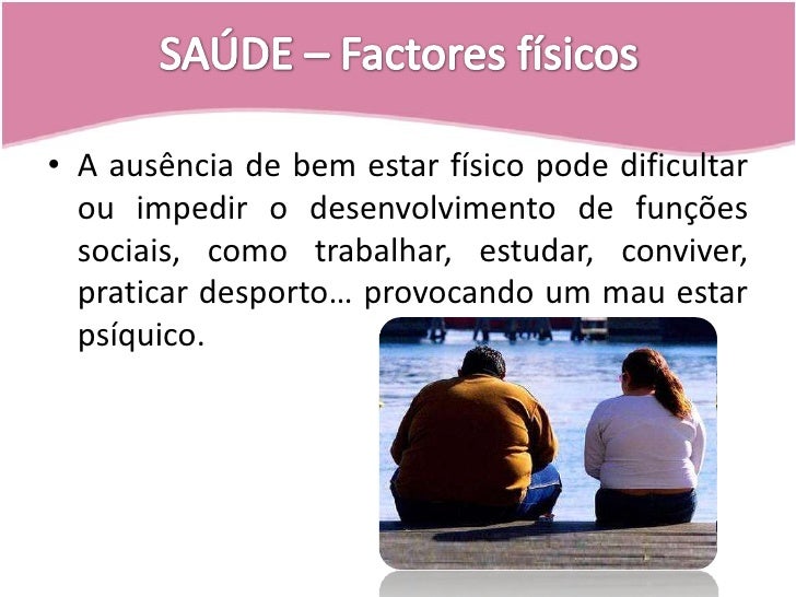 33. 33. SAÚDE – Factores físicos<br />A ausência de bem estar físico pode dificultar ou impedir o desenvolvimento de funções sociais, como trabalhar, estudar, conviver, praticar desporto… provocando um mau estar psíquico.<br />