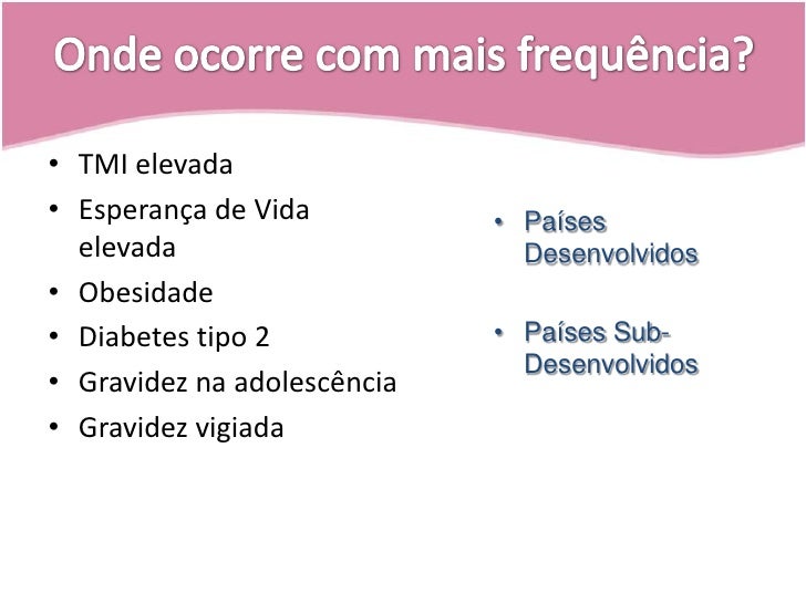 38. 38. Onde ocorre com mais frequência? <br />TMI elevada<br />Esperança de Vida elevada<br />Obesidade<br />Diabetes tipo 2<br />Gravidez na adolescência<br />Gravidez vigiada<br /><ul><li>Países Desenvolvidos