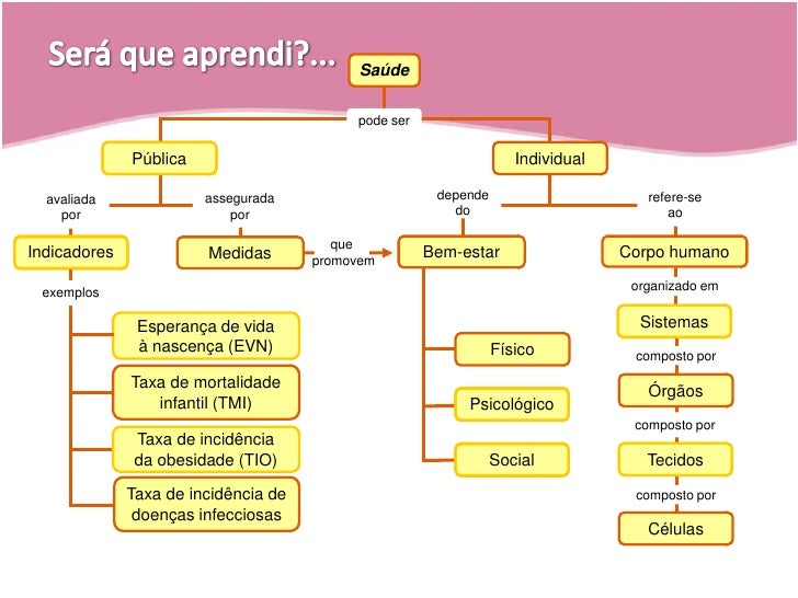 42. 42. pode ser<br />refere-se ao<br />assegurada por<br />avaliada por<br />depende do<br />que<br /> promovem<br />organizado em<br />exemplos<br />composto por<br />composto por<br />composto por<br />Saúde<br />Individual<br />Pública<br />Corpo humano<br />Bem-estar<br />Indicadores<br />Medidas<br />Sistemas<br />Esperança de vida à nascença (EVN)<br />Físico<br />Taxa de mortalidade infantil (TMI)<br />Órgãos<br />Psicológico<br />Taxa de incidência da obesidade (TIO)<br />Social<br />Tecidos<br />Taxa de incidência de doenças infecciosas<br />Células<br />Será que aprendi?...<br />